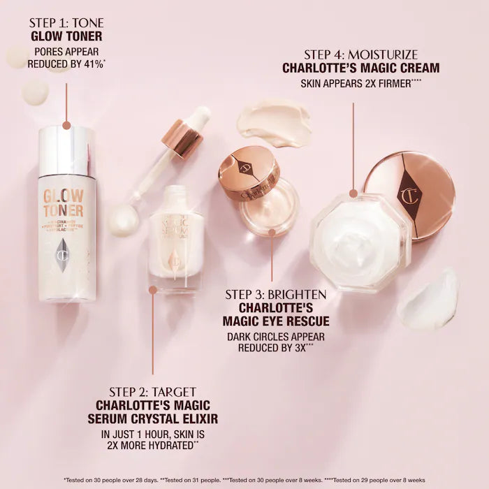 Qué es: Un juego de valor de cuatro minis de cuidado de la piel más vendidos, incluyendo Glow Toner, Magic Serum, Magic Eye Cream y Magic Cream para un brillo radiante sobre la marcha.